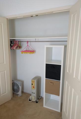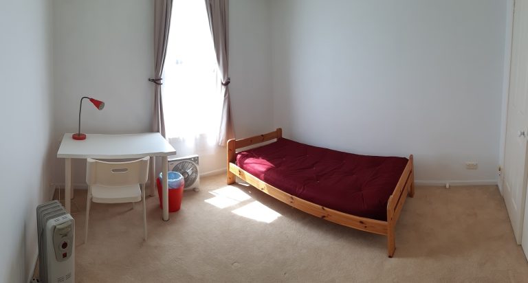 – 部屋は3mx3mほどの大きさで、クローゼット、ベットベース(シングル)、マットレス、机、イス、扇風機&オイルヒーター付きです。