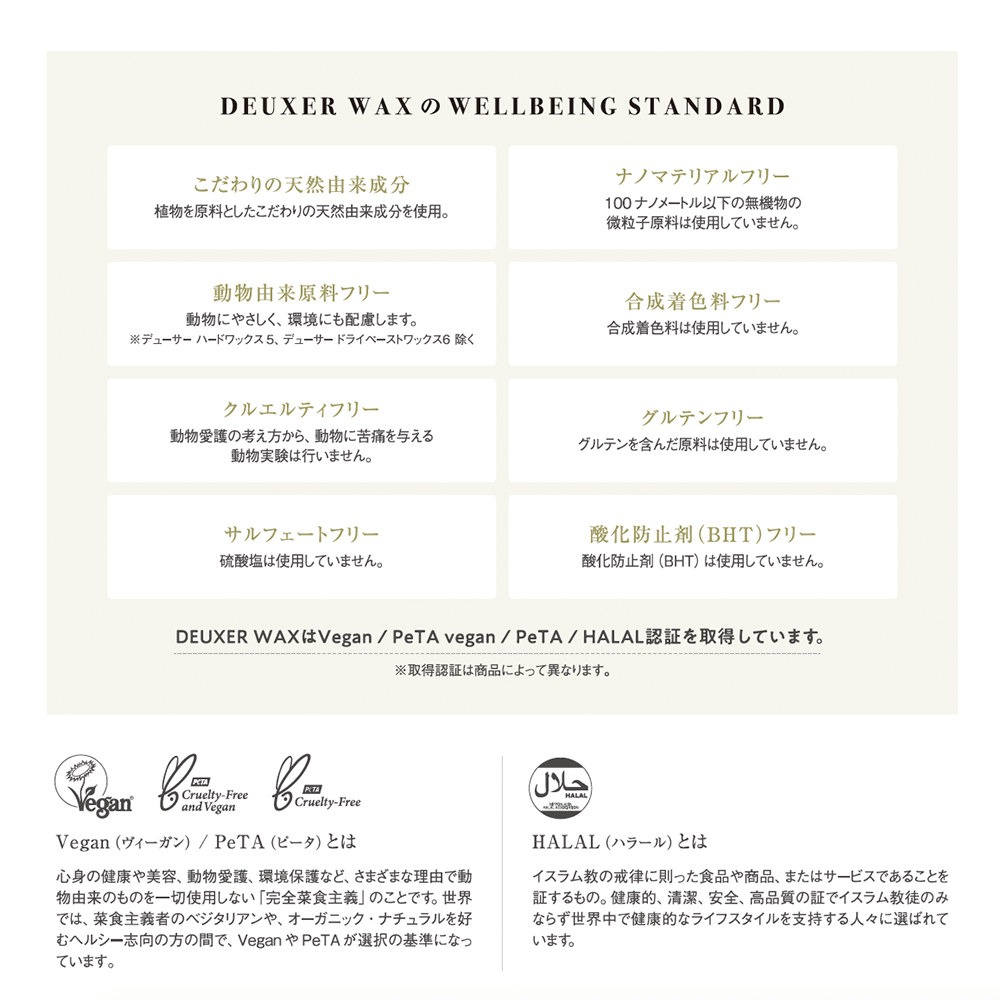 DEUXER WAXはVegan/ PeTA vegan/ HALAL認証を取得。