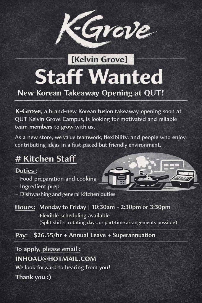 K-Grove, a brand-new Korean fusion takeaway opening soon at QUT Kelvin Grove Campus, is looking for motivated and reliable team members to grow with us.