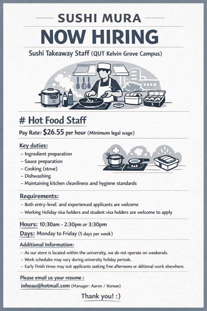 We are a sushi takeaway store operating on the QUT Kelvin Grove campus and are currently seeking staff for the position below.