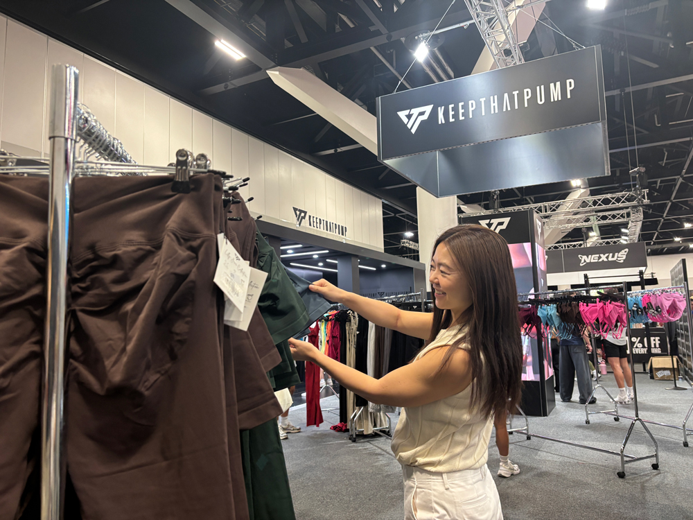 日本でも数年前から女性を中心に「尻トレ」のブームは続いていますが、日本人とは骨格が違うオーストラリアではお尻を重点的に鍛えるというよりもファンクショナル・トレーニングと桃尻トレーニングを行い、なおかつ桃尻を協調させるようなバックデザインのアクティブ・ウェアを着るのが主流なようです。トレーニングの成果を披露しながら、さらにトレーニングするようなトレンドが続いているようで、女性用アクティブ・ウェアの大半がヒップをより丸く協調できるデザインのものが出展されていました。