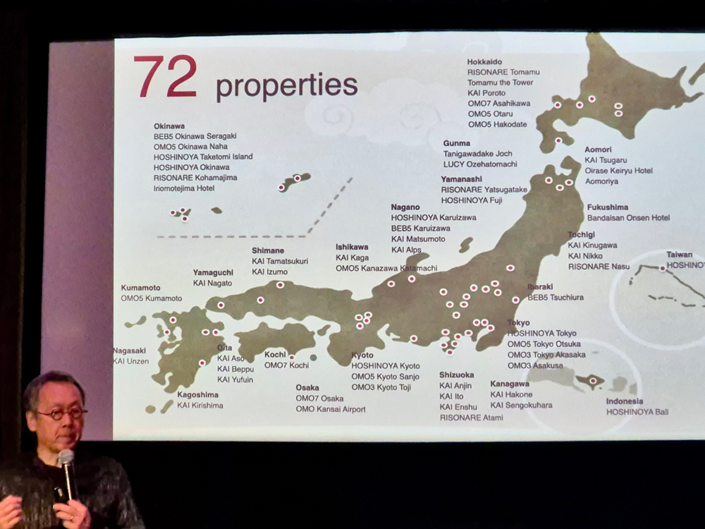 星野氏の「私は年に80日スキーをします。つい先日もニュージーランドで3週間ほど滑ってきました」というユーモラスな自己紹介から始まり、ホテルの歴史や概要、オーストラリア旅行者への取り組みについて説明した。星野リゾートには、国内外の旅行者のニーズに合わせた6つのホテル・ブランドがあり、例えば日本の伝統的温泉旅館「界」、都市型観光に特化した「OMO」、そして今年新しく立ち上げられた山のホテル「LUCY」など、比較的小規模な宿泊施設を全国各地で展開している。