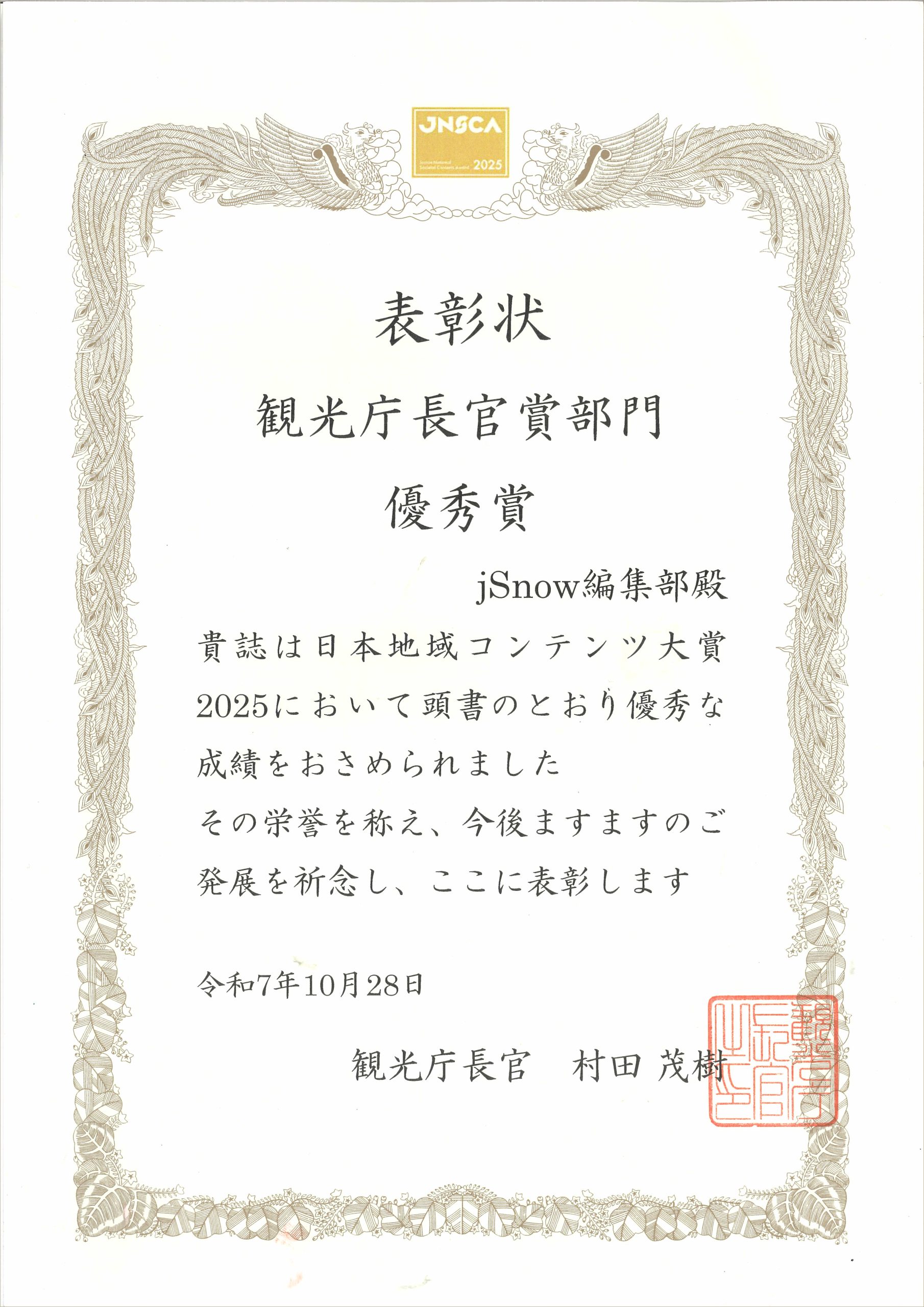 日豪プレスが発行する英語版スノーリゾート専門誌『jSnow』は、地域の魅力を発信する優れたメディアを表彰する「日本地域コンテンツ大賞」において、観光部門優秀賞を受賞した。