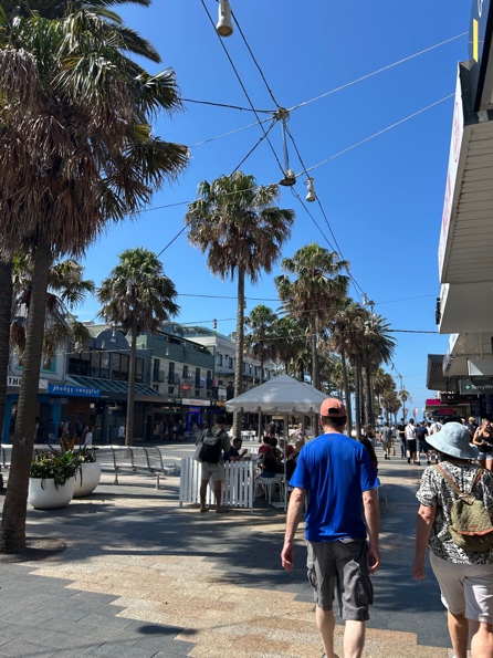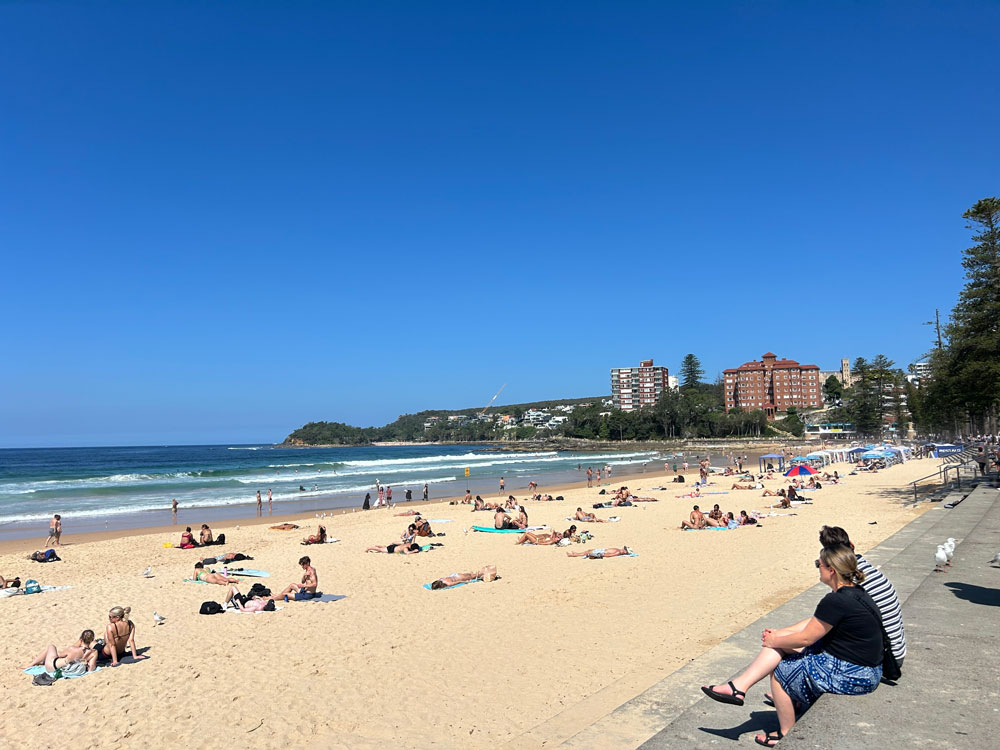 最後に訪れたマンリー・ビーチは、ノーザン・ビーチズの中でも特に人気の大きなビーチだ。砂浜には多くの人が集まり、海では泳ぐ人やサーフィンを楽しむ人の姿が見られる。周辺にはお土産店やレストラン、カフェなども多く、観光地としての雰囲気も強い。