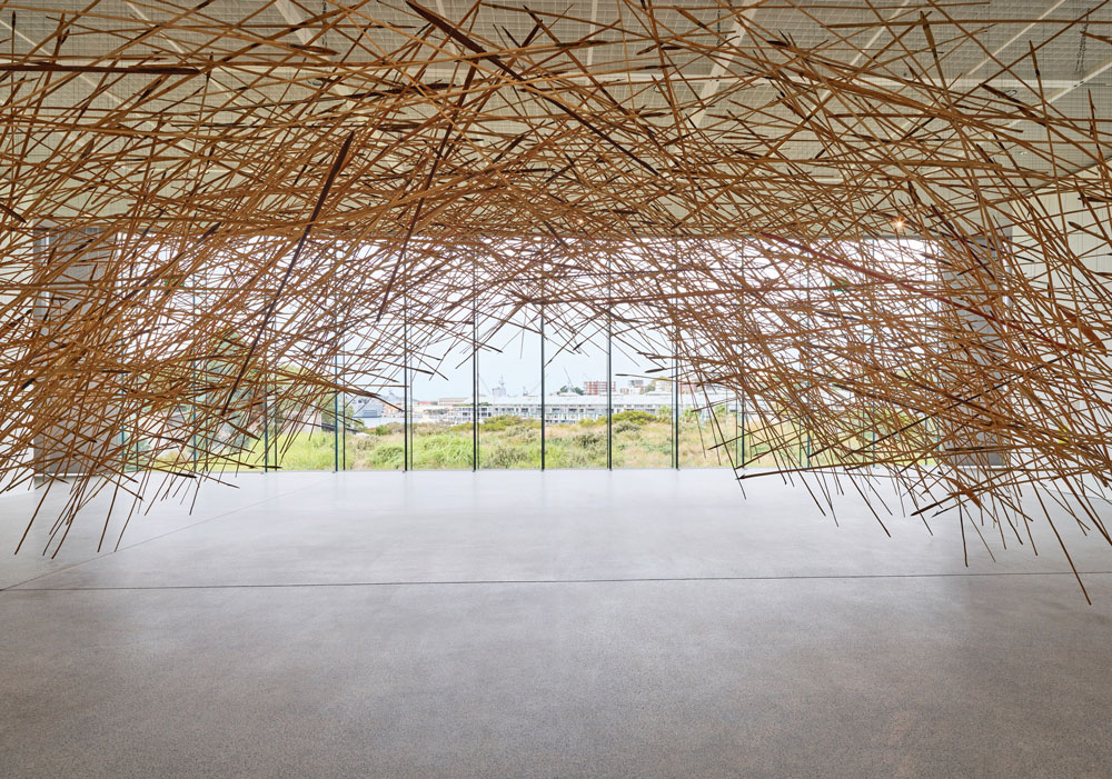 「Kulata Tjuta(Many Spears)」はアーティスト、フランク・ヤング(Frank Young)とアナング地域のコミュニティーによる共同プロジェクトで、1500本に及ぶ手作りの槍によってアーチ状に構成された大規模なインスタレーションです。